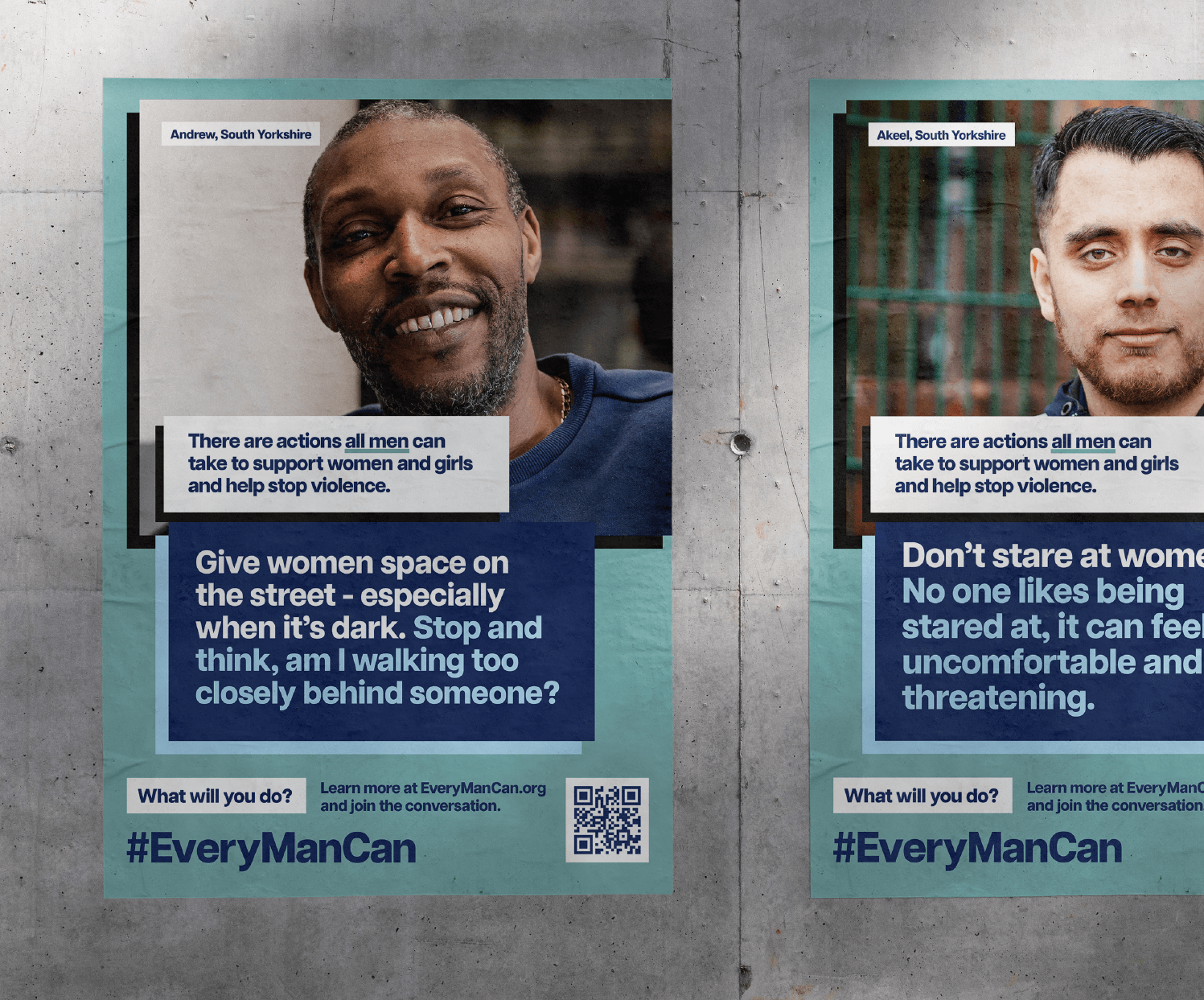 We aimed to avoid scare tactics, avoid moralistic messages and present healthy social norms already existing among men in South Yorkshire. We also wanted to avoid making all men feel like perpetrators, and we didn’t want women to feel the campaign minimises the danger, violence, and abuse they face.
