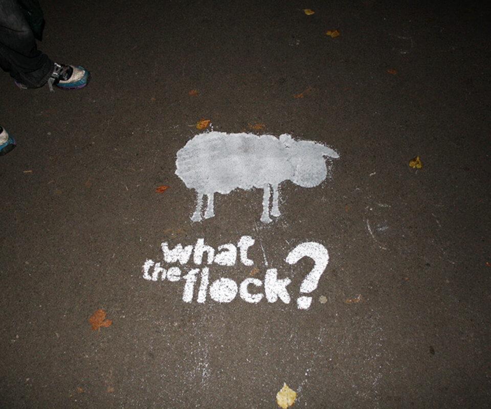 The brand, What the Flock, was displayed using black and white to stand out against the visual noise of campus communications, keep costs low, and give the campaign an ‘underground’ aesthetic.